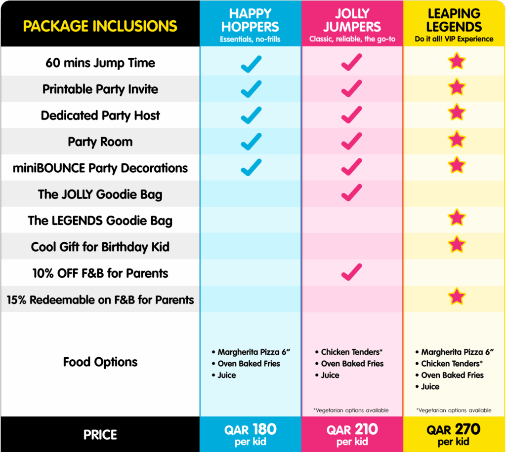 Yup – we’ve got crowd-pleasers like pizza, chicken strips, and juice. Got dietary needs? Let us know when booking. We’ve got different packages and options for all your needs. Just please, no outside food.
