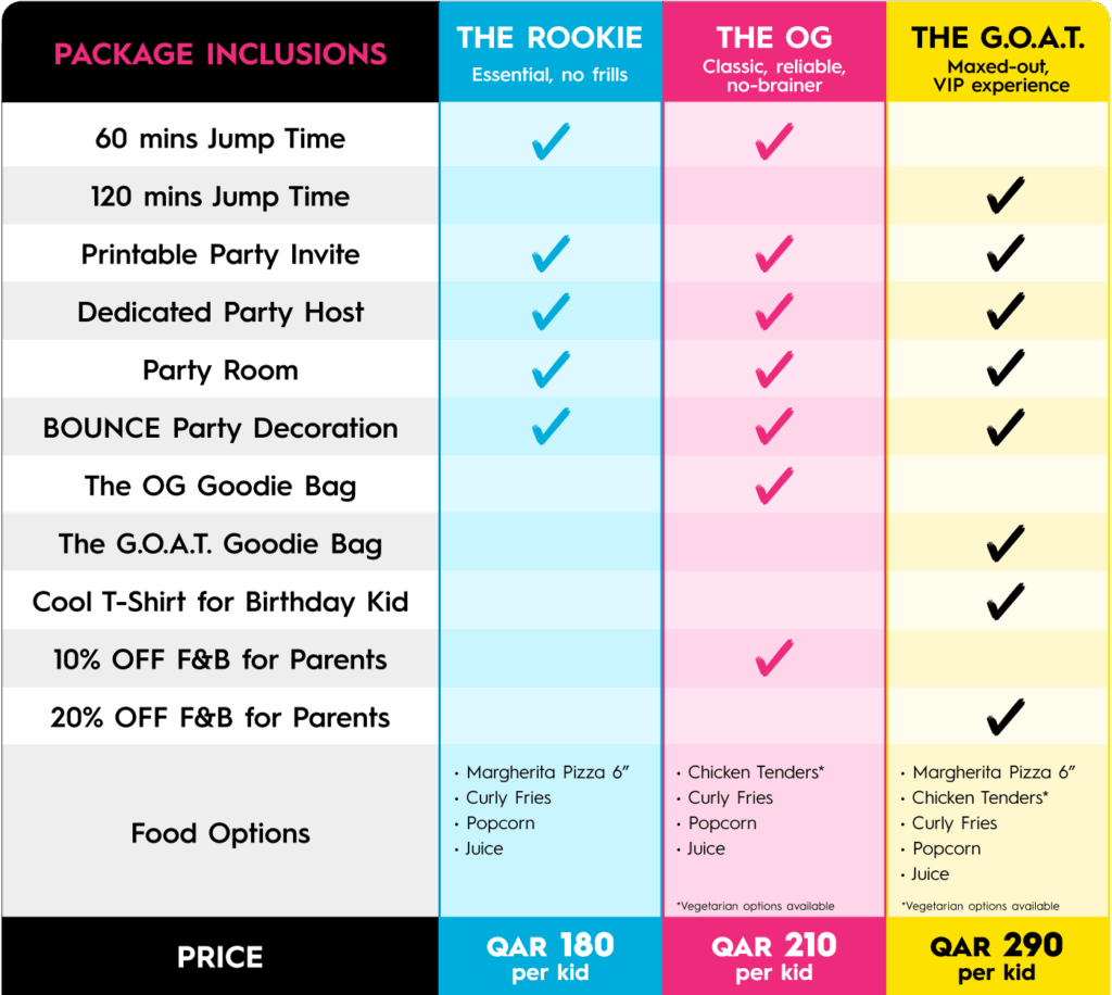 Parties typically run for 2 hours – that’s the ENERGIZER – 15 minutes of Meet and Greet, 60 minutes of ACTION – adventuring and games, followed by 45 minutes of CELEBRATION in the party room for food, songs, and celebrations. Our GOAT package features an extra 60 minutes of jump time for a total of 2 hours! The Whole time a BOUNCE Birthday Host will guide and take care of your every need!